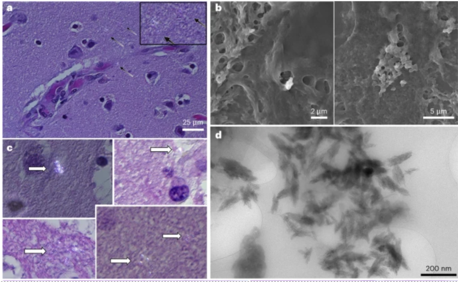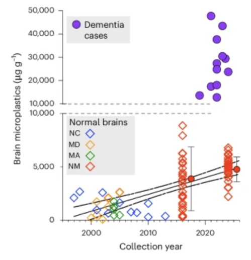 Figure 2: Microplastics in micrograms found in brains with dementia (top) and normal brains (bottom). (Nihart et al., 2025) https://doi.org/10.1038/s41591-024-03453-1
