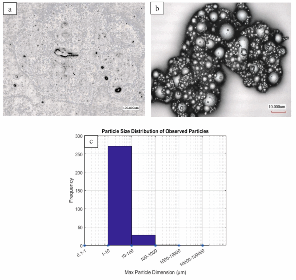 Particle size distribution and image analysis for polystyrene microplastic in cookies: (a) PS-BaSO4 microplastic (b) purchased standard microplastic (c) particle size distribution of microplastic. (Beigmohammadi et al., 2025)
